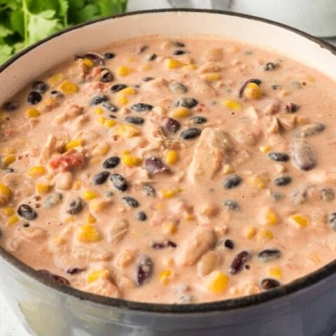 Quick and simple Chicken Chili combines shredded chicken, beans, Rotel and corn into a creamy, seasoned chili in just 20 minutes!