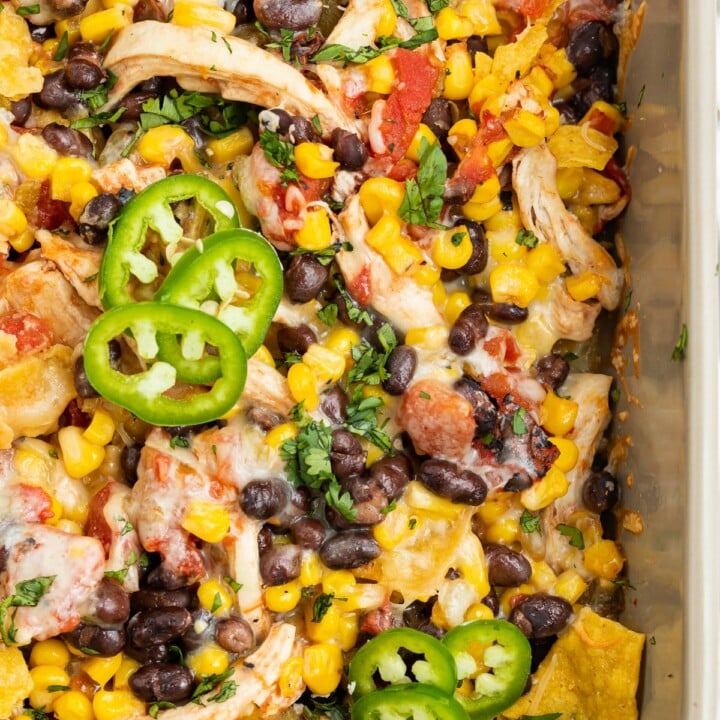 Layers of juicy shredded chicken, crunchy crushed tortilla chips, savory black beans, and rich roasted tomatoes, tied together with deliciously melty cheese. It’s a total crowd pleaser!
