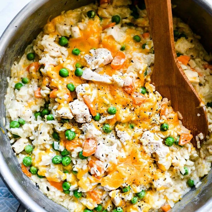 This creamy chicken and rice casserole is a fast and healthy 30-minute meal made right on the stove top, making it a favorite one-pot dinner that feeds a family of four for under $10.
