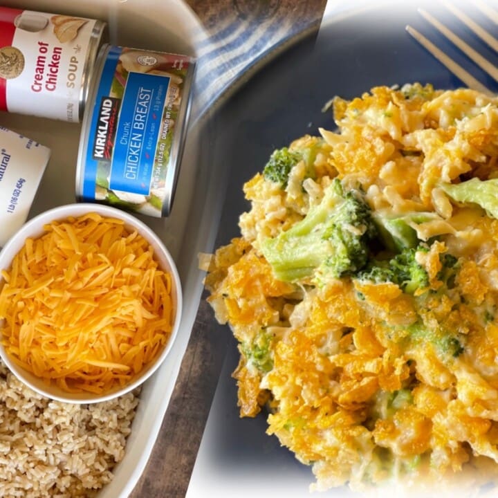 This cheesy dinner casserole is made with simple ingredients including canned chicken, Instant rice, and frozen broccoli, making it extra lazy for busy weeknight meals.