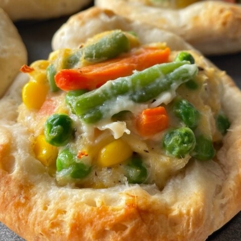 Pillsbury biscuits stuffed full of a delicious mixture of canned chicken, frozen mixed veggies, and a can of soup, baked in a muffin pan to create handheld mini chicken pot pies.