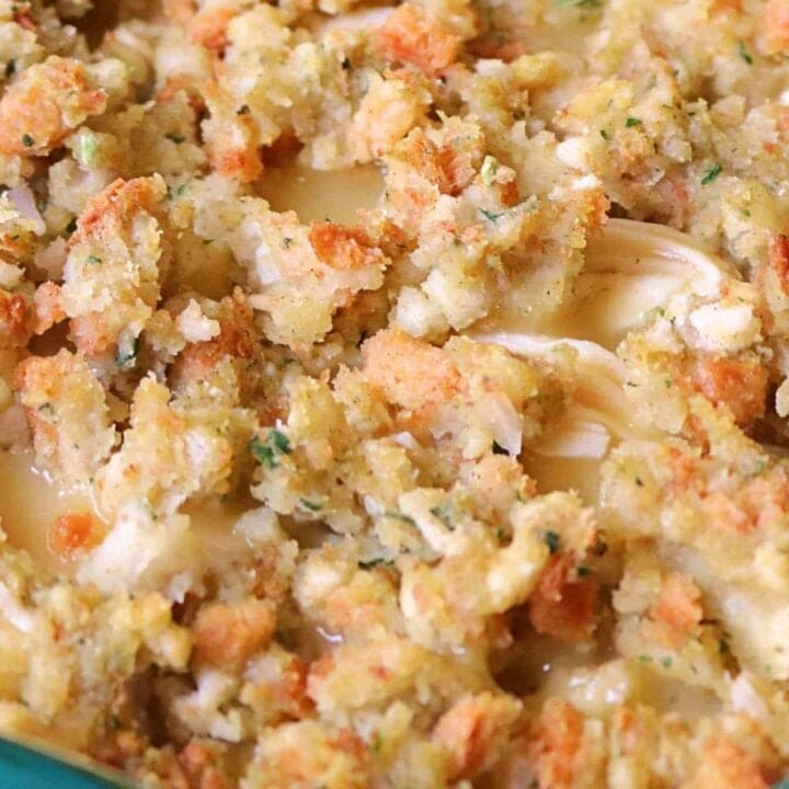 This Easy Chicken and Stuffing Casserole with Stove Top is made with just 4 ingredients including seasoned shredded chicken, cream of chicken soup, milk, and Stove Top stuffing.