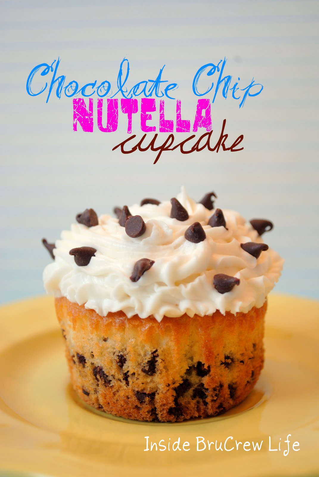 Vanilla chocolate chip cupcakes filled with a Nutella cheesecake center and frosted with vanilla butter cream